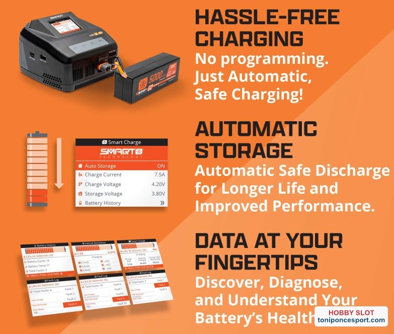 Nunca tendrá que configurar las preferencias de carga de una batería Spektrum Smart hasta que usted quiera. Cuando una batería Spektrum Smart LiPo se conecta a un cargador Spektrum Smart, los parámetros únicos y la salud de esa batería Smart LiPo se cargan desde el microchip de memoria Smart integrado en la batería. A través del cargador, puede ver y configurar las preferencias, como las velocidades de carga, de modo que lo único que tenga que hacer para cargar el pack cada vez sea pulsar el botón "Start" del cargador. La tecnología inteligente se encarga del resto.