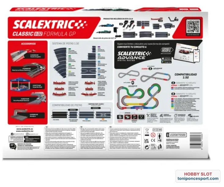 Scalextric Formula GP a escala 1:32. Circuito completo con dos coches tipo F1, mandos y transformador. Ideal para amantes de la Fórmula 1 y el slot racing. Compatible con sistema Scalextric Original.