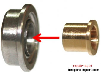 Con esta nueva solución es posible, de forma muy económica, utilizar cualquier artículo con base Ø 2,38 mm. (llantas, ejes, coronas, topes de corona, etc ...) y usarlos en cualquier modelo que, de serie, solo equipe cojinetes para eje de Ø 3 mm. (BRM, Revo Slot, TTS etc...)