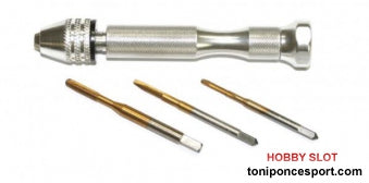 Mango con portabrocas que facilita, por su comodidad, el roscado en un chasis metálico, Aluminio, plástico o plástico 3D, o en cualquier pieza de Slot como una corona, una llanta, un Stopper o dónde sea necesario, pues es cómodo de sujetar y ofrece la máxima precisión para realizar este tipo de tareas.