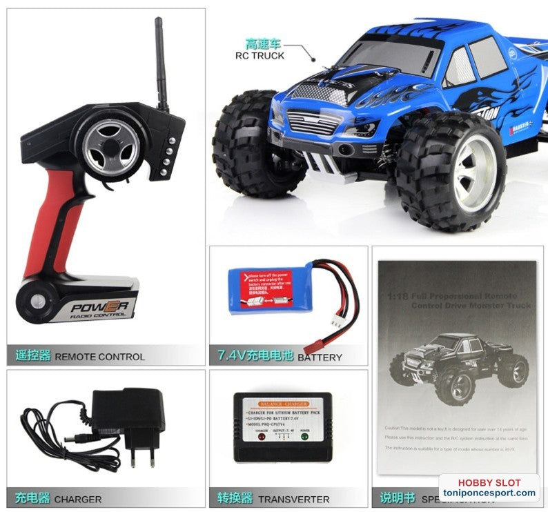 WLT-WA979 Este es un coche monster eléctrico de todo terreno de escala 1/18 RTR ideal para iniciarse en el mundo del radio control a un precio muy asequible. Viene completamente montado y listo para ser usado. La tracción a las cuatro ruedas, el potente motor 390 brushed, la suspensión independiente con 4 amortiguadores hidráulicos capaces de absorber todo tipo de baches y la utilización de batería de Li-Po le proporcionan unas prestaciones espectaculares para poder utilizarlo en cualquier tipo de terreno.