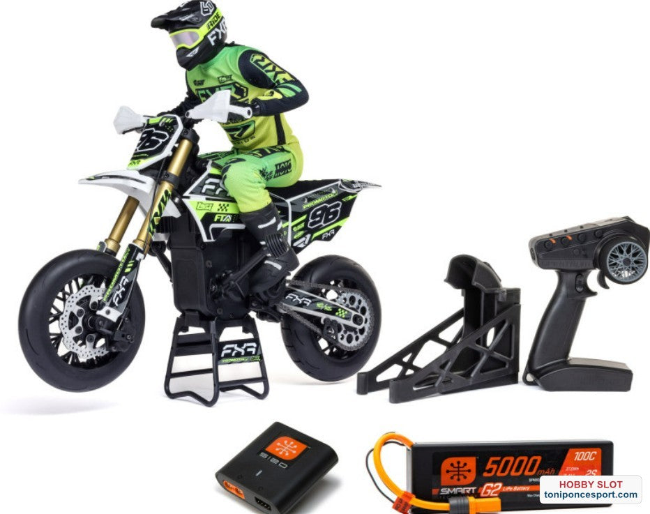 La Losi Promoto-SM también tiene el aspecto de una auténtica supermoto. Sus detalles visuales distintivos incluyen protectores de manos, guardabarros delantero acortado y gráficos y equipamiento de piloto FXR con licencia oficial.