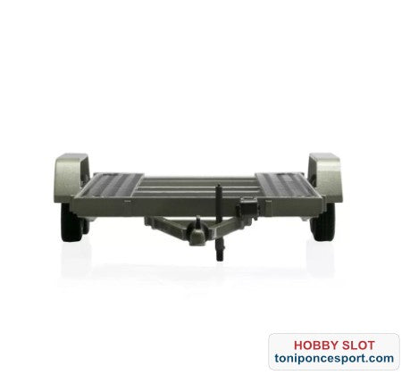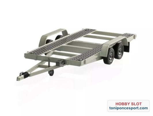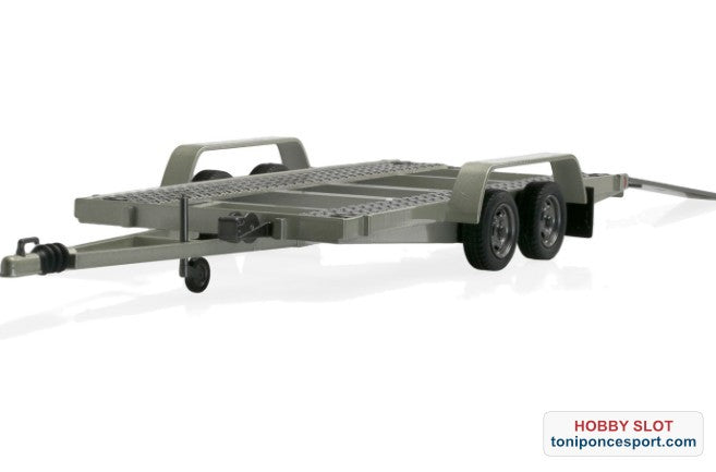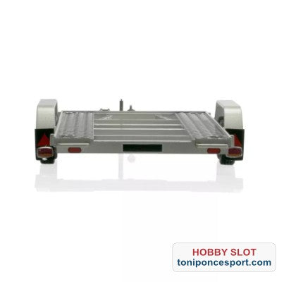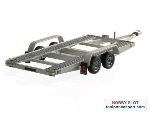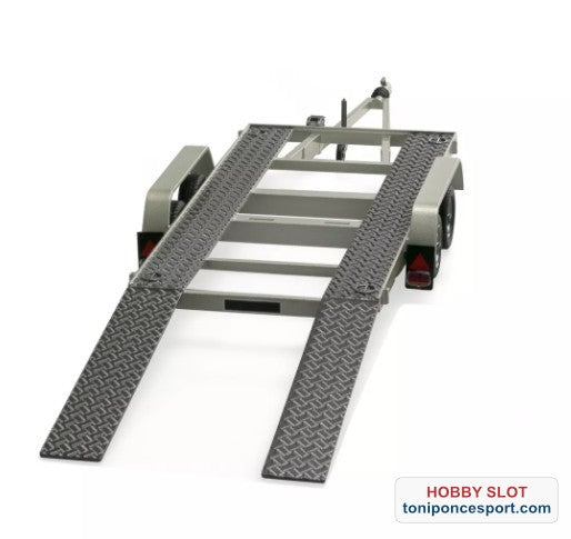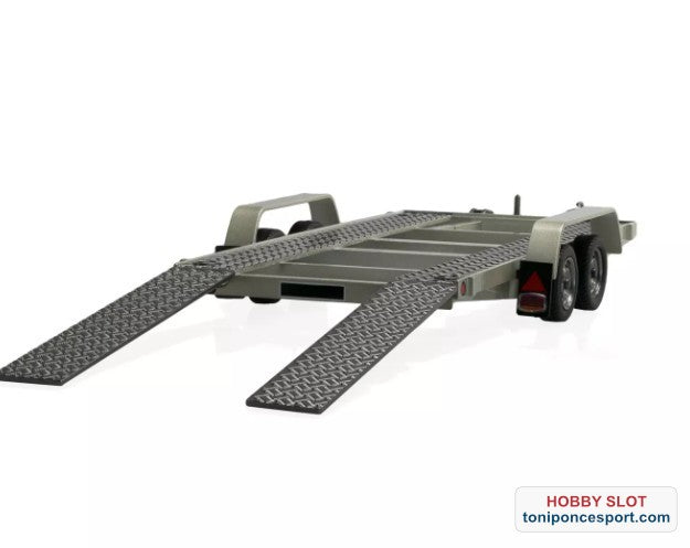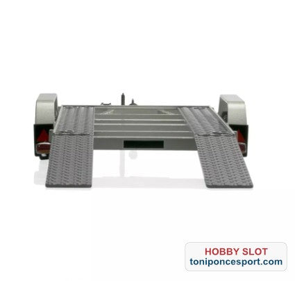 OT-225D Remolque portacoches con ruedas exteriores tipo años 80 fabricado íntegramente en metal inyectado. El remolque se suministra con dos rampas también fabricadas en metal inyectado.