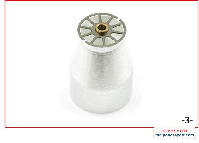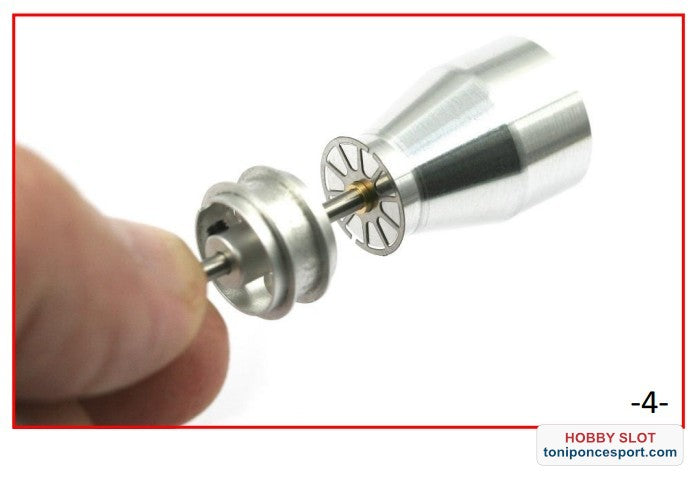 Seguidamente coloque el casquillo de latón en el orificio del cono de Aluminio y después encaje el tapacubos en el casquillo de latón tal y como se muestra en la imagen -3-.