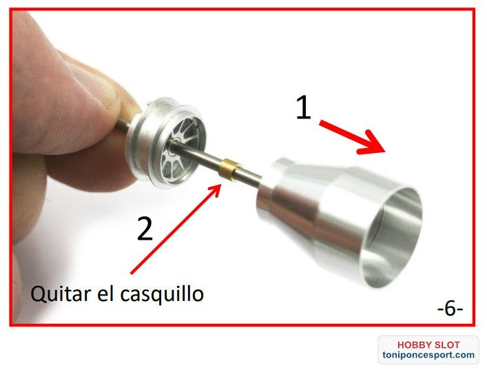 Con el tapacubos, ya en el interior de la llanta, saque el cono del eje y quite el casquillo de latón como se muestra en la imagen -6-.
